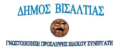 Ο Δήμαρχος Βισαλτίας Γ ν ω σ τ ο π ο ι ε ί την πλήρωση μιας (01) θέσης Ειδικού Συνεργάτη Δημάρχου, ειδικότητας ΠΕ Νομικών – Δικηγόρων,η οποία θα καλυφθεί με σύμβαση εργασίας Ιδιωτικού Δικαίου Ορισμένου Χρόνου, η διάρκεια της οποίας δεν μπορεί να υπερβεί τη θητεία της τρέχουσας δημοτικής περιόδου,