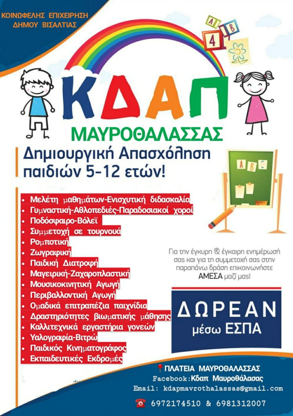 Δεκαπέντε χρόνια κλείνουν φέτος τα Κέντρα Δημιουργικής Απασχόλησης Παιδιών της Κοινωφελούς Επιχείρησης Δήμου Βισαλτίας. Μια μακρόχρονη πορεία προσφοράς σε παιδιά, με στήριξη των οικογενειών τους και πλήθος δημιουργικών δραστηριοτήτων. Φέτος, τη χρονιά 2020-2021, καλοσωρίζουμε στη μεγάλη οικογένεια των ΚΔΑΠ της Κοινωφελούς Επιχείρησης Δήμου Βισαλτίας, ένα νέο μέλος, το Κέντρο Δημιουργικής Απασχόλησης Παιδιών Μαυροθάλασσας, στο οποίο θα λειτουργήσουν οργανωμένες δραστηριότητες.