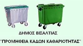 Συνοπτικό διαγωνισμό , με σφραγισμένες προσφορές και κριτήριο κατακύρωσης, της πλέον συμφέρουσα από οικονομική άποψη προσφοράς, βάσει τιμής, για τη Σύναψη Σύμβασης Προμήθειας με τίτλο «Προμήθεια Κάδων απορριμμάτων για τις ανάγκες της υπηρεσίας καθαριότητας».