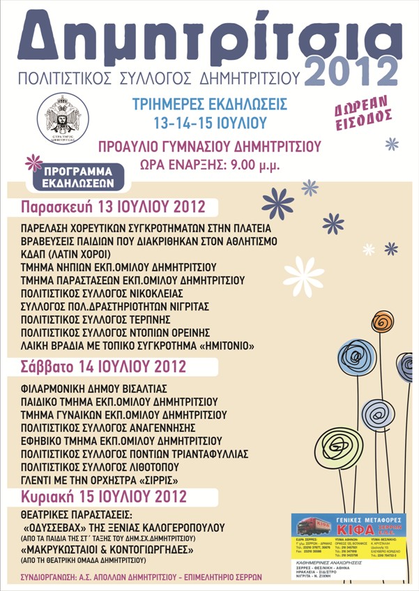 Τριήμερες πολιτιστικές εκδηλώσεις διοργανώνει ο δραστήριος Πολιτιστικός Σύλλογος Δημητριτσίου στα πλαίσια του καταξιωμένου πολιτιστικού θεσμού«Δημητρίτσια»