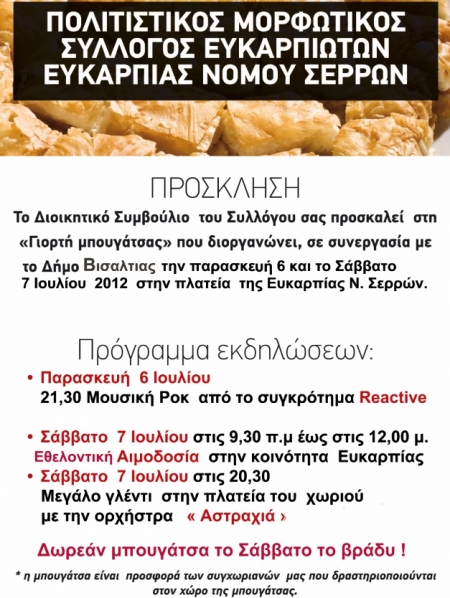 Ο Πολιτιστικός Μορφωτικός Σύλλογος Ευκαρπιωτών Ευκαρπίας Νομού Σερρών σε συνεργασία με το Δήμο Βισαλτίας διοργανώνουν την , για τρίτη συνεχή χρονιά, το διήμερο Παρασκευή 6 Ιουλίου και Σάββατο 7 Ιουλίου 2012 την «Γιορτή Μπουγάτσας» που τείνει να γίνει θεσμός πολιτισμού και παράδοσης.