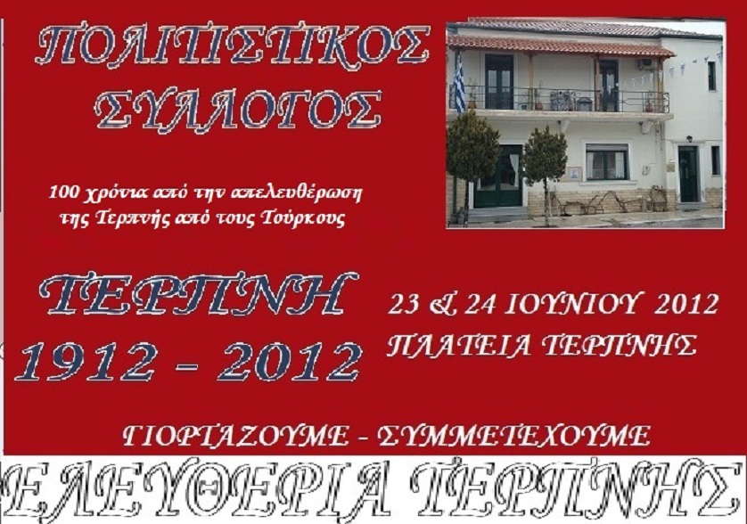 Η Πρόεδρος και το Δ.Σ του Πολιτιστικού Συλλόγου Τερπνής καλούν όλους τους πολίτες του Δήμου Βισαλτίας να τιμήσουν με την παρουσία σας τις εκδηλώσεις των ΕΛΕΥΘΕΡΙΩΝ ΤΕΡΠΝΗΣ (1912-2012) για τα 100 χρόνια από την απελευθέρωση της Τερπνής από τους Τούρκους.