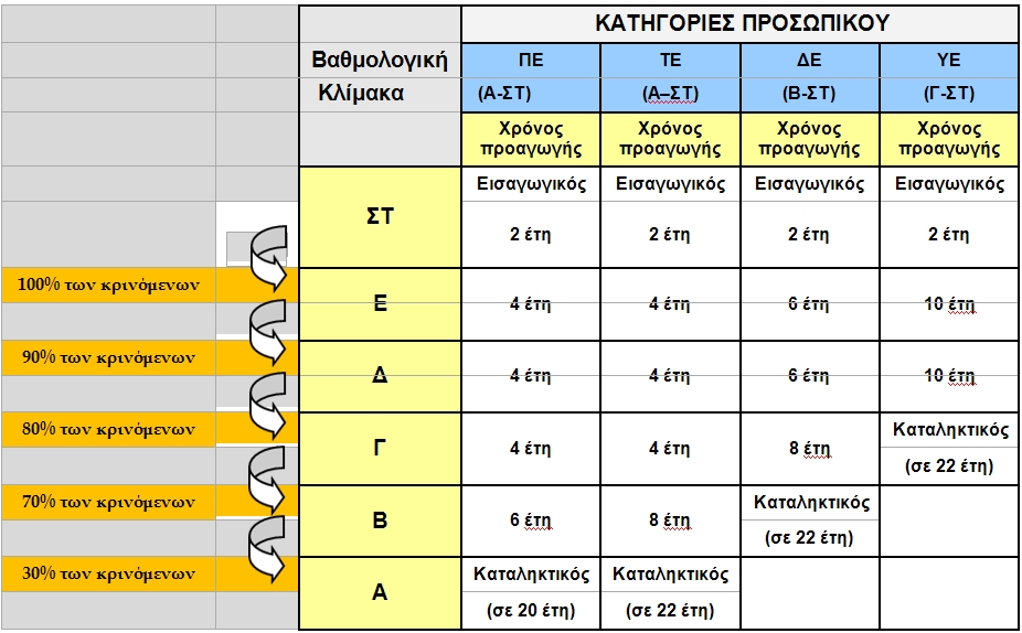 Σύμφωνα με το νέο νομοθετικό πλαίσιο η νέα βαθμολογική κλίμακα περιλαμβάνει έξι βαθμούς. Ως εισαγωγικός βαθμός για όλες τις κατηγορίες εκπαίδευσης προσωπικού είναι ο Βαθμός ΣΤ, καταληκτικός βαθμός για την κατηγορία ΠΕ και ΤΕ είναι ο Βαθμός Α, για την κατηγορία ΔΕ ο Βαθμός Β και για την κατηγορία ΥΕ ο Βαθμός Γ. Εισαγωγικός βαθμός για τους κατόχους συναφούς διδακτορικού διπλώματος είναι ο Βαθμός Δ, με συνολική βαθμολογική και μισθολογική προώθηση έξι ετών, εισαγωγικός βαθμός για τους κατόχους συναφούς μεταπτυχιακού τίτλου σπουδών είναι ο Βαθμός Ε, με συνολική βαθμολογική και μισθολογική προώθηση δύο ετών.